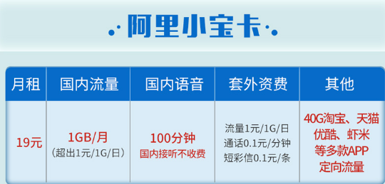 这款套餐主要是分为阿里19元小宝卡套餐和阿里59元大宝卡套餐,其套餐内主要的区别是,阿里小宝卡套餐每个月有1GB的全国流量和100分钟的国内语音免费接听,阿里大宝卡则是每个月2GB的全国流量和500分钟的国内语音免费接听。